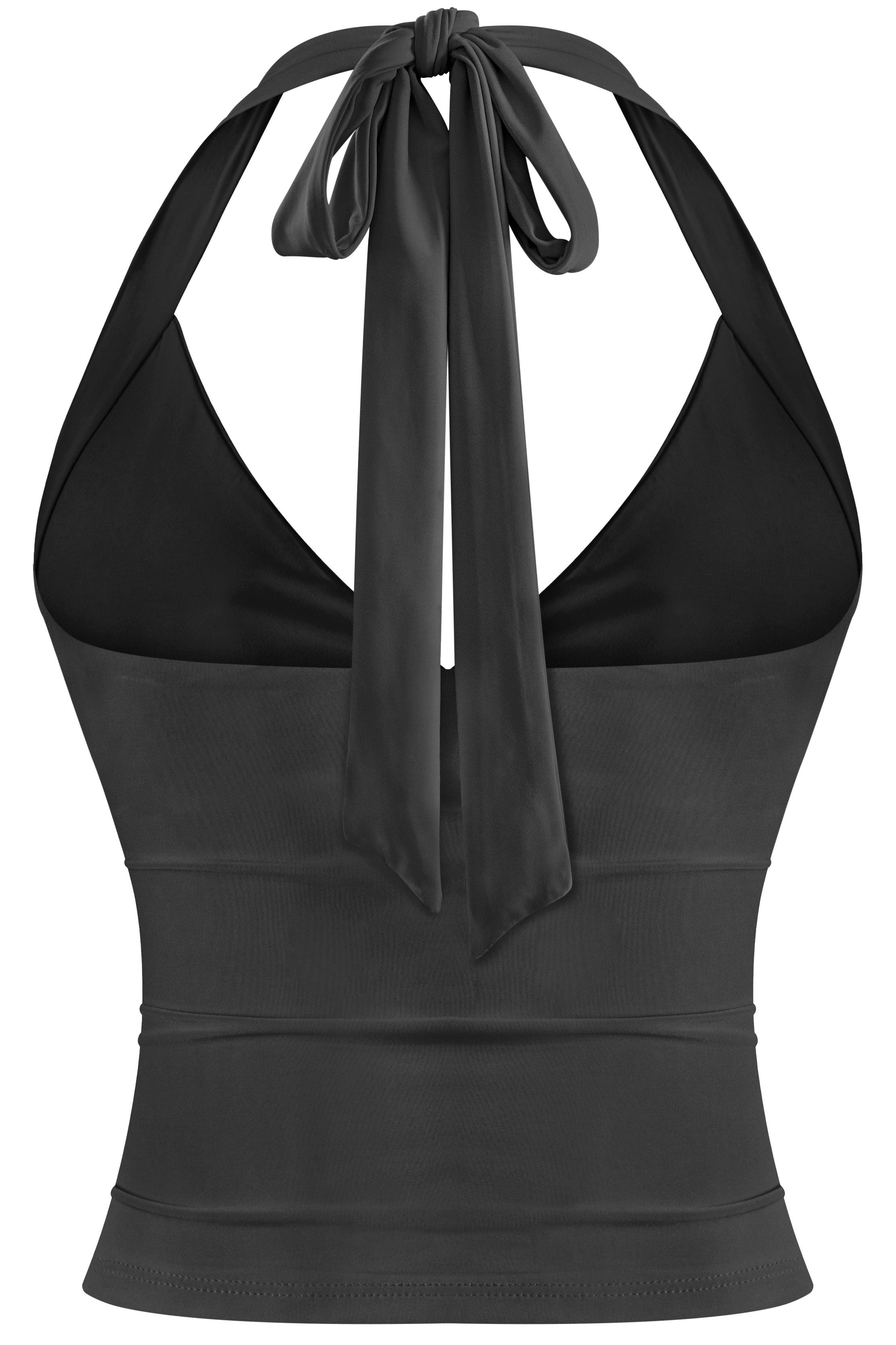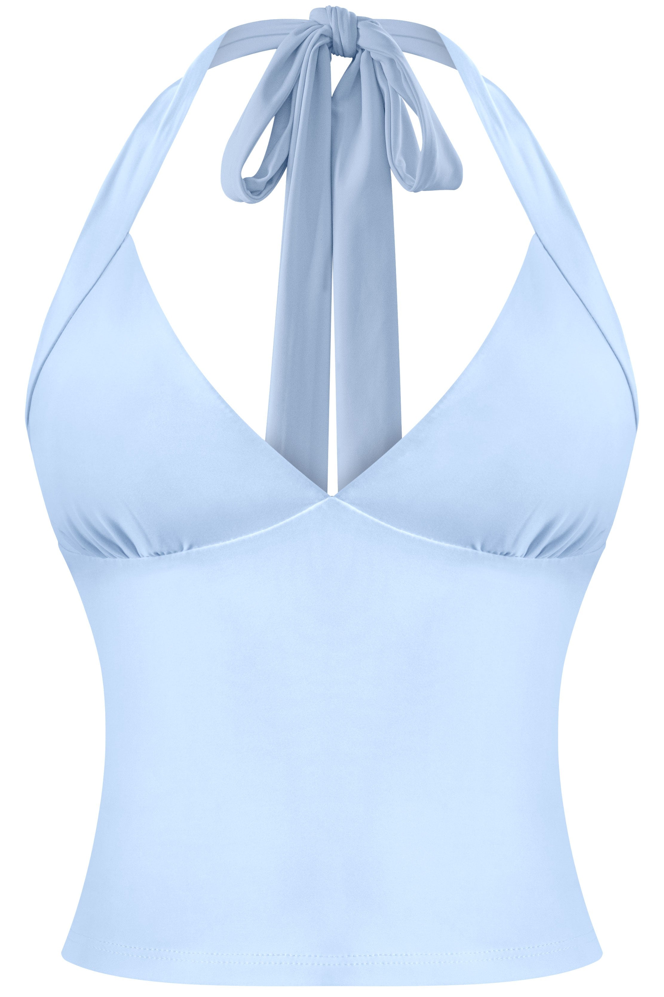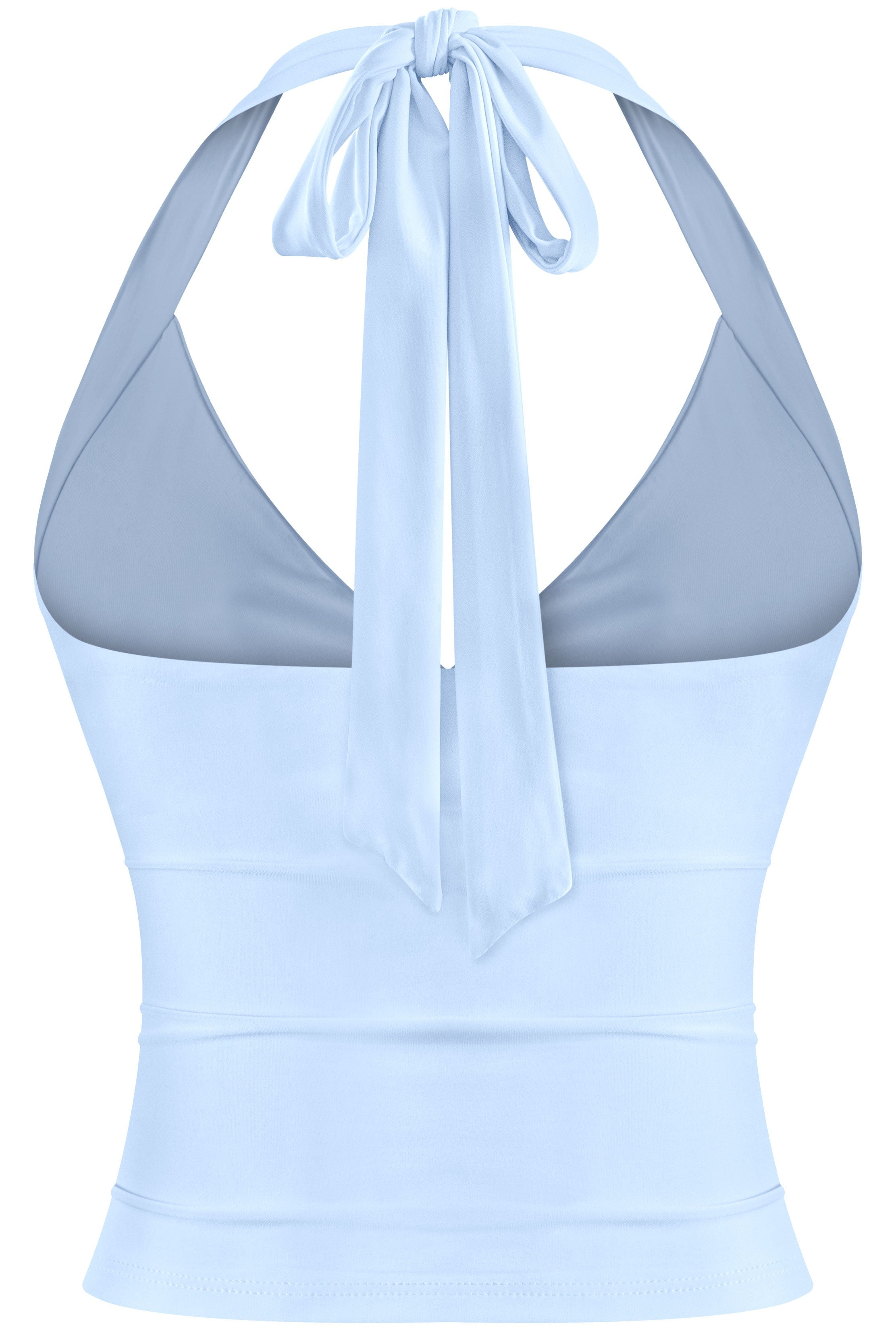 A sleek, double-layered halter crop with a deep V neckline and adjustable back ties. Designed in a soft, stretchy fabric that holds shape and hugs the body. Minimal, fitted, and easy to style — this one works with everything from low-rise cargos to maxi skirts.