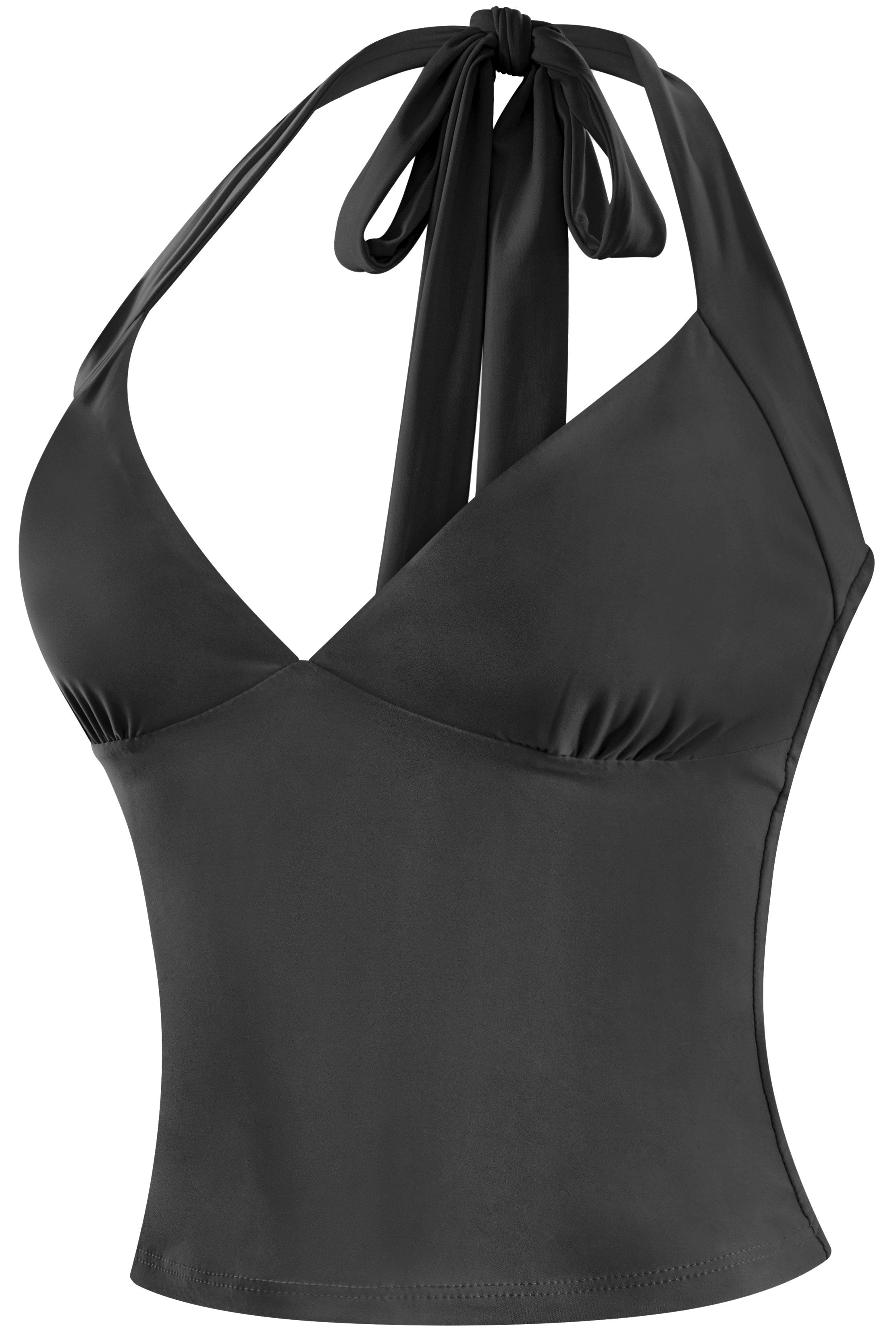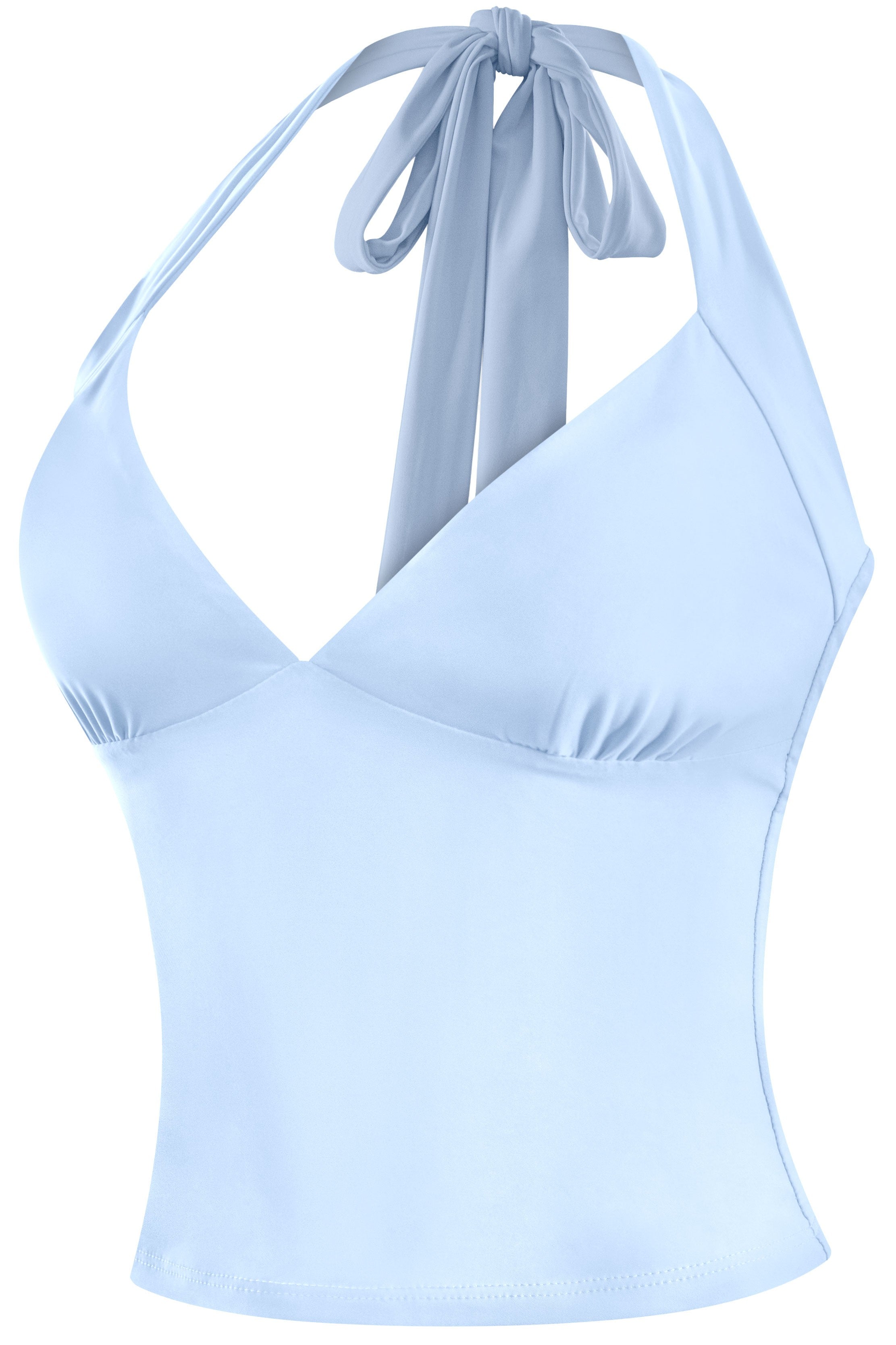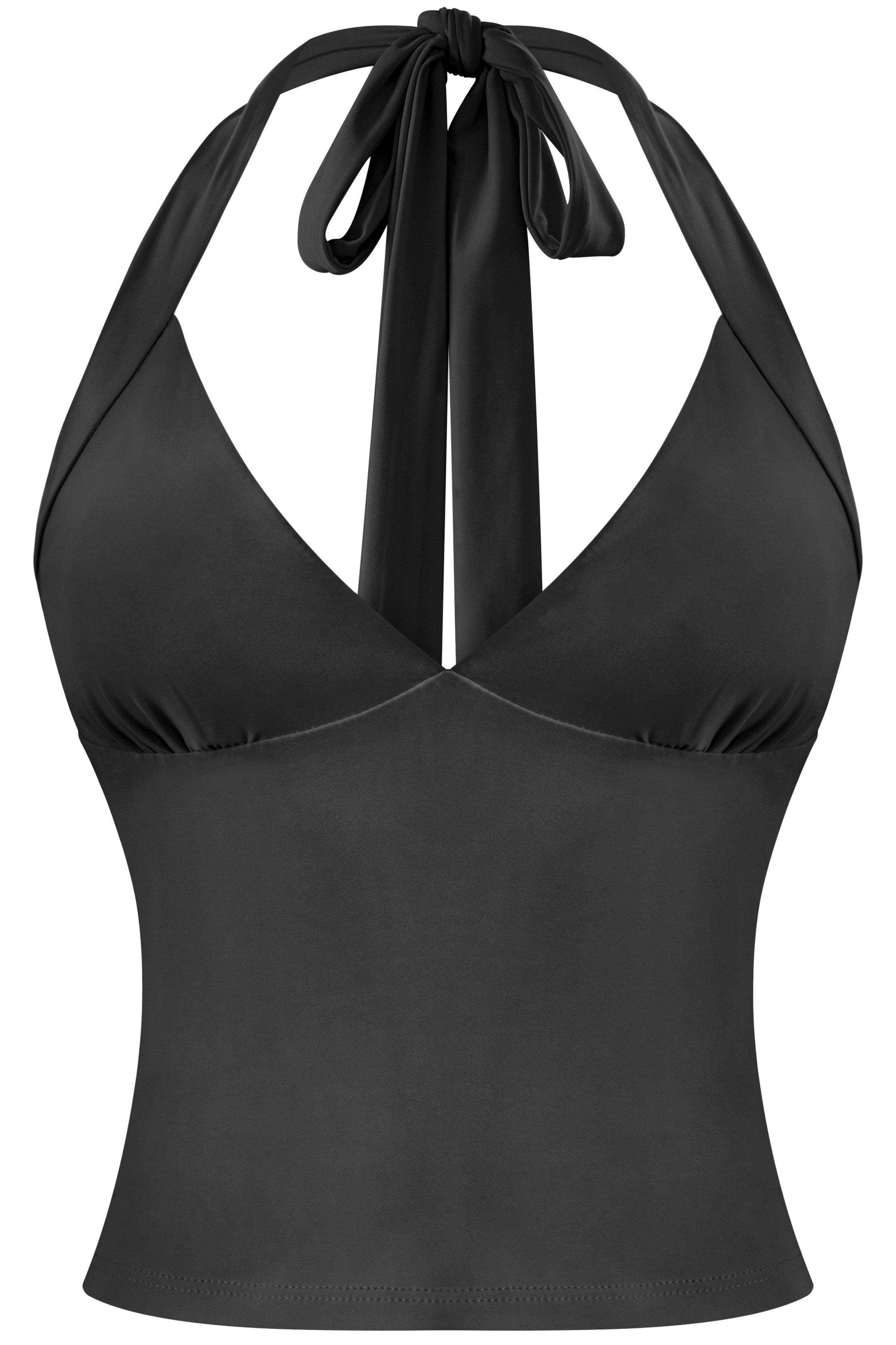 A sleek, double-layered halter crop with a deep V neckline and adjustable back ties. Designed in a soft, stretchy fabric that holds shape and hugs the body. Minimal, fitted, and easy to style — this one works with everything from low-rise cargos to maxi skirts.
