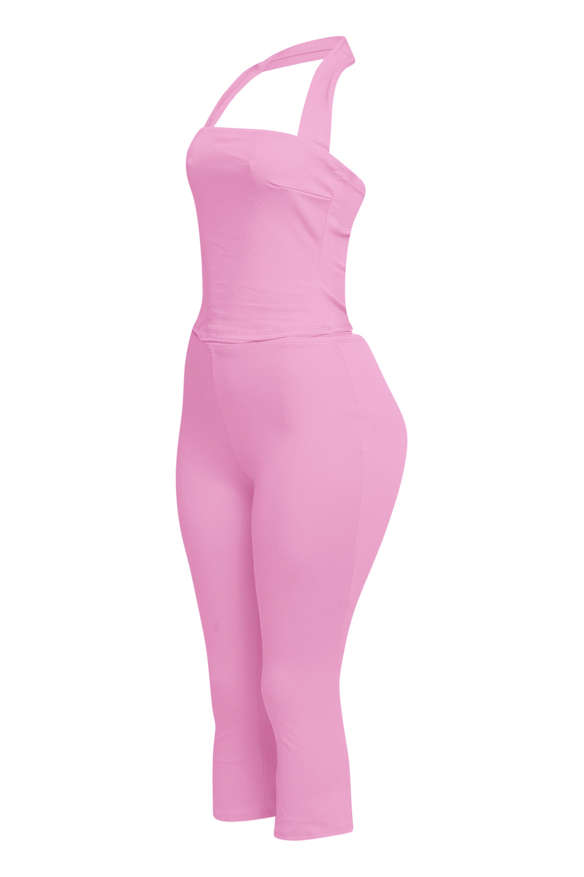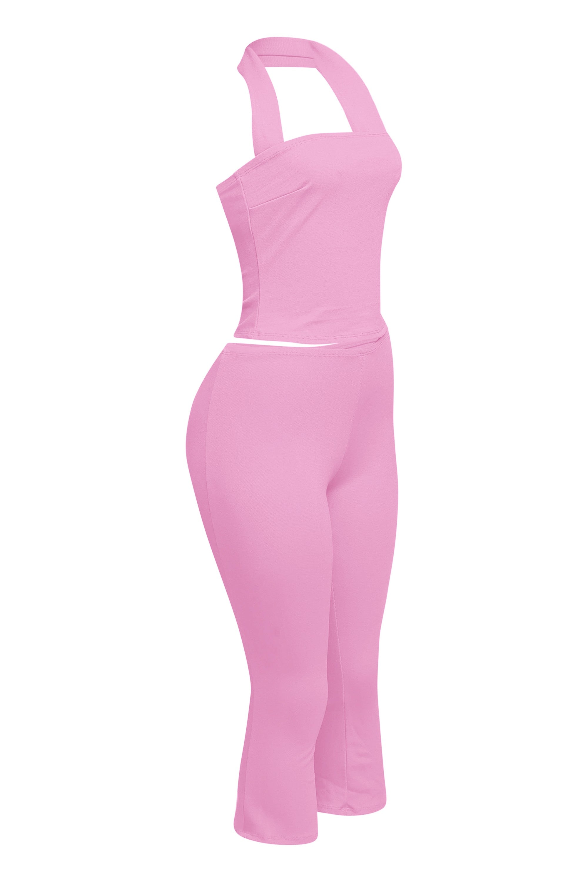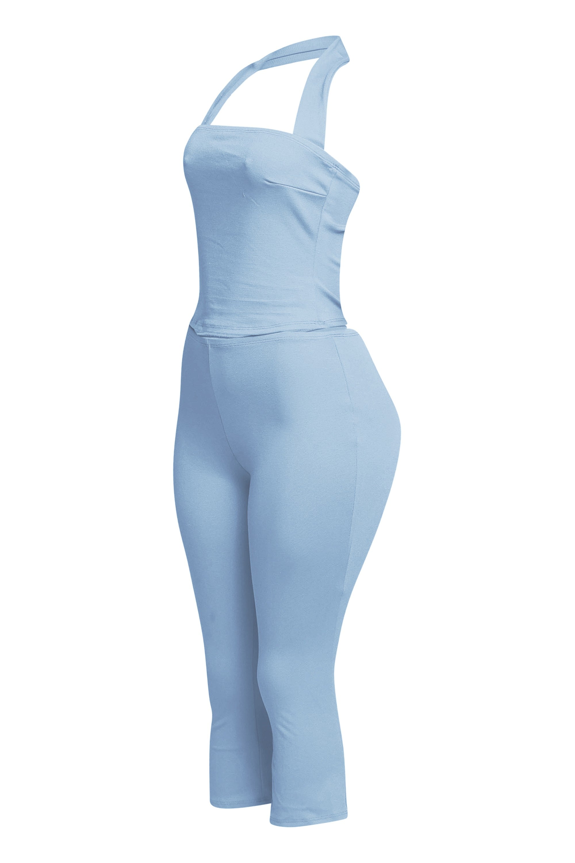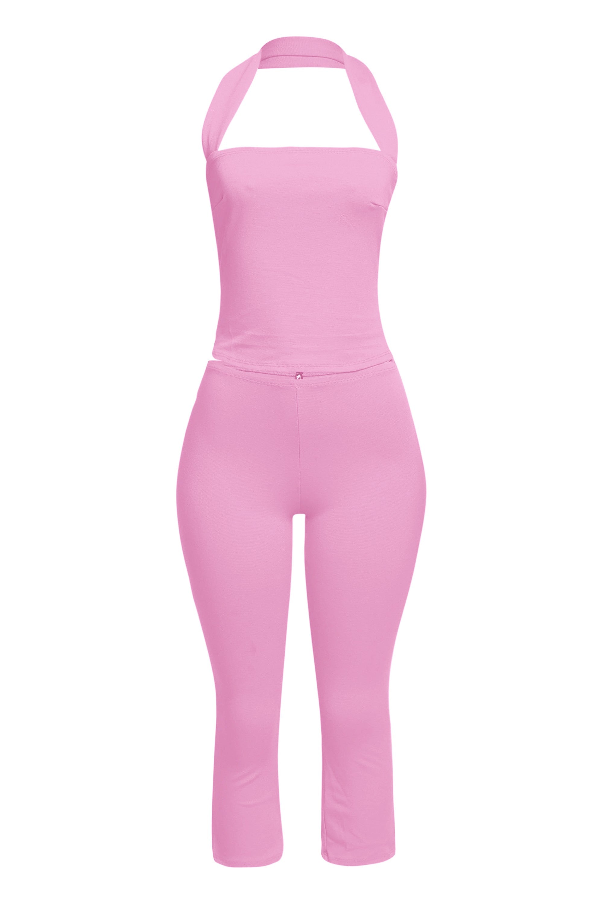 Matching set featuring a halter neck crop top and slim-fit capri pants. Made in a smooth, stretchy fabric that hugs the body. Easy to wear and easy to style — this set is made for warm days and effortless looks.