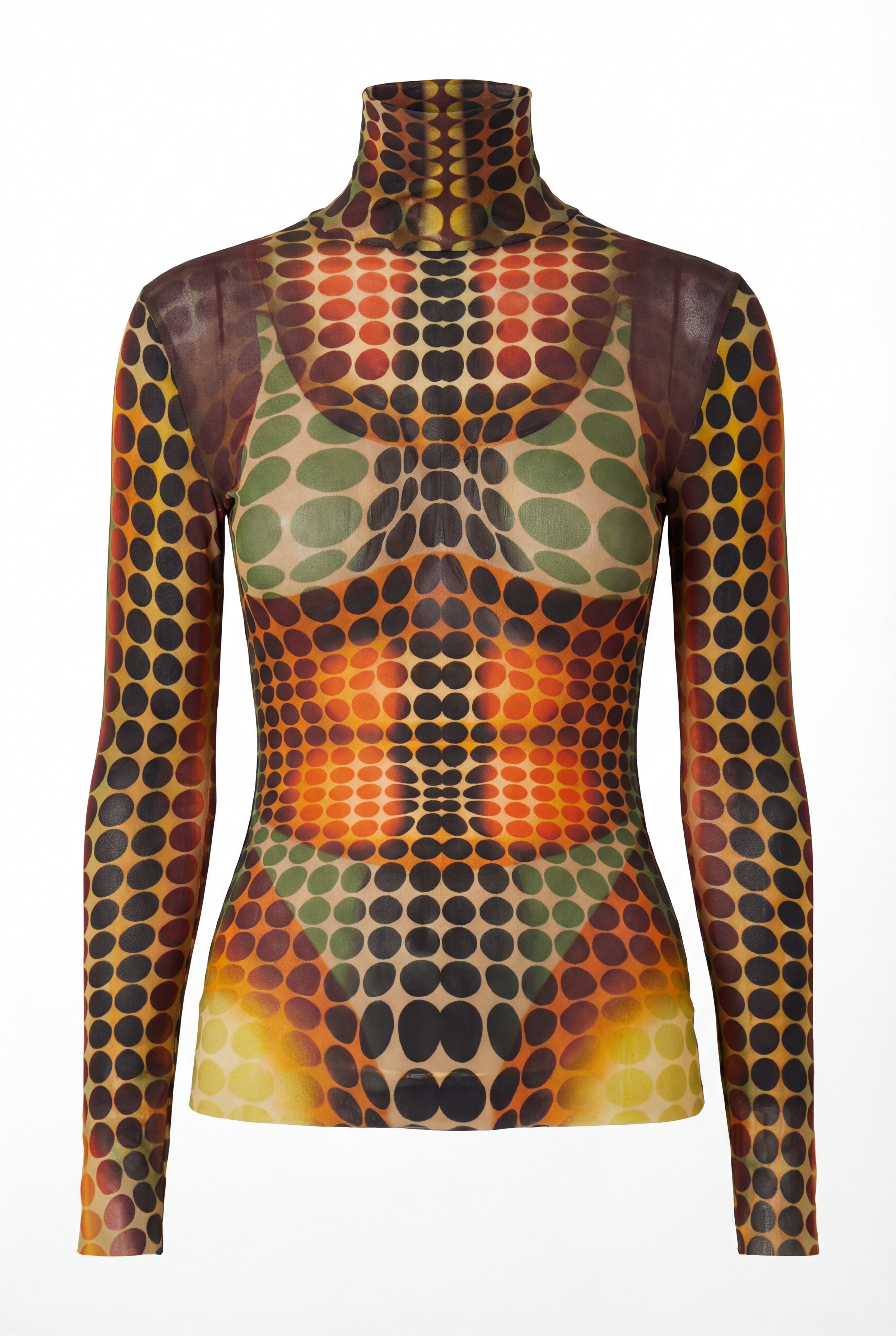 An iconic Jean Paul Gaultier mesh top featuring the house’s signature trompe l’oeil illusion print. This cyber dot design is one of Gaultier’s most recognizable visual motifs, celebrated for its body contouring effect and futuristic aesthetic that defined the brand’s late nineties and early two thousands era.