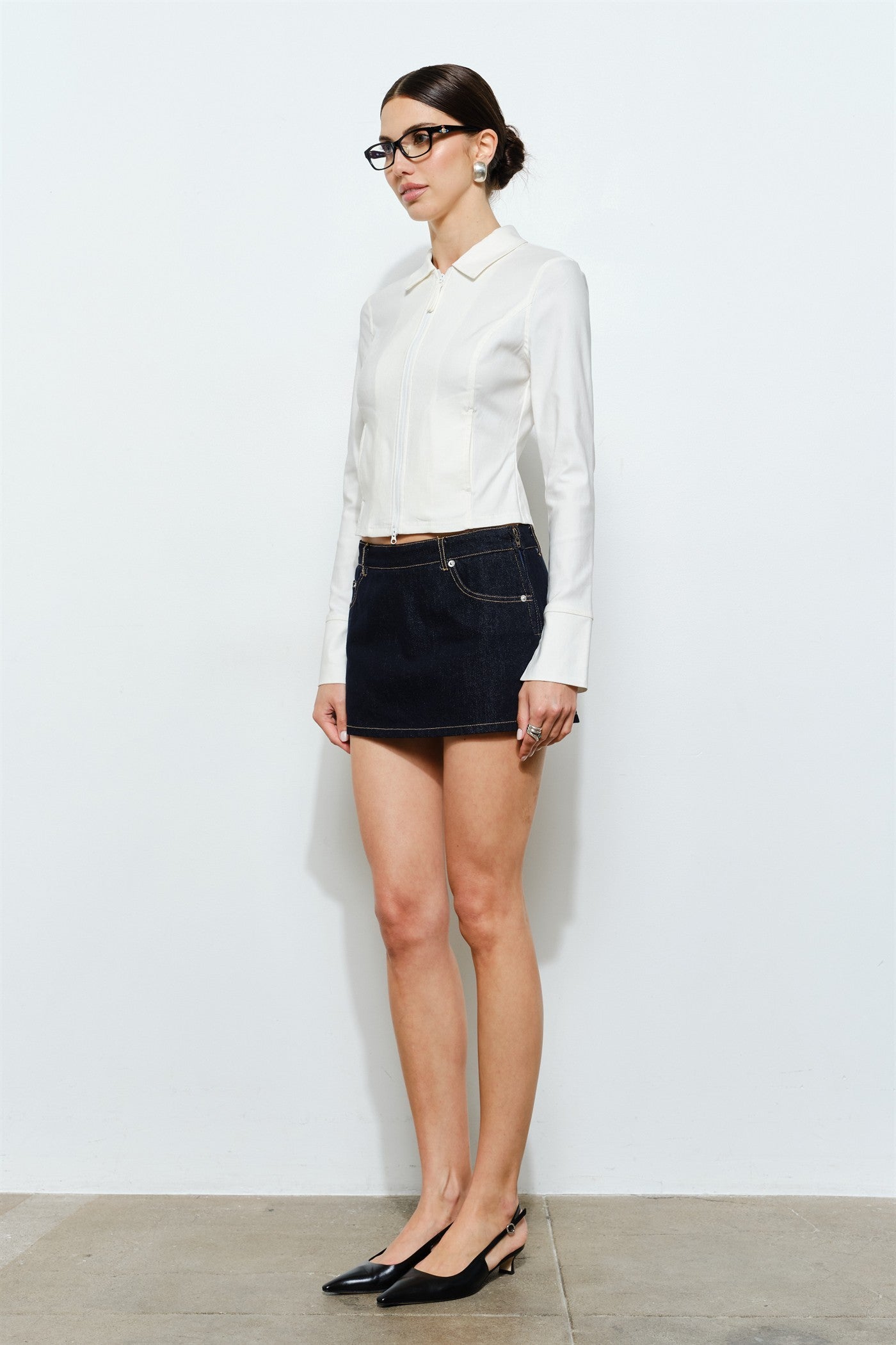 The Maia Top gives a modern edge to a timeless collared silhouette. Designed with a functional two-way zipper and tailored seams, it creates a structured, body-hugging fit that’s both sleek and versatile. Perfect for layering or wearing on its own, this piece transitions effortlessly from day to night.