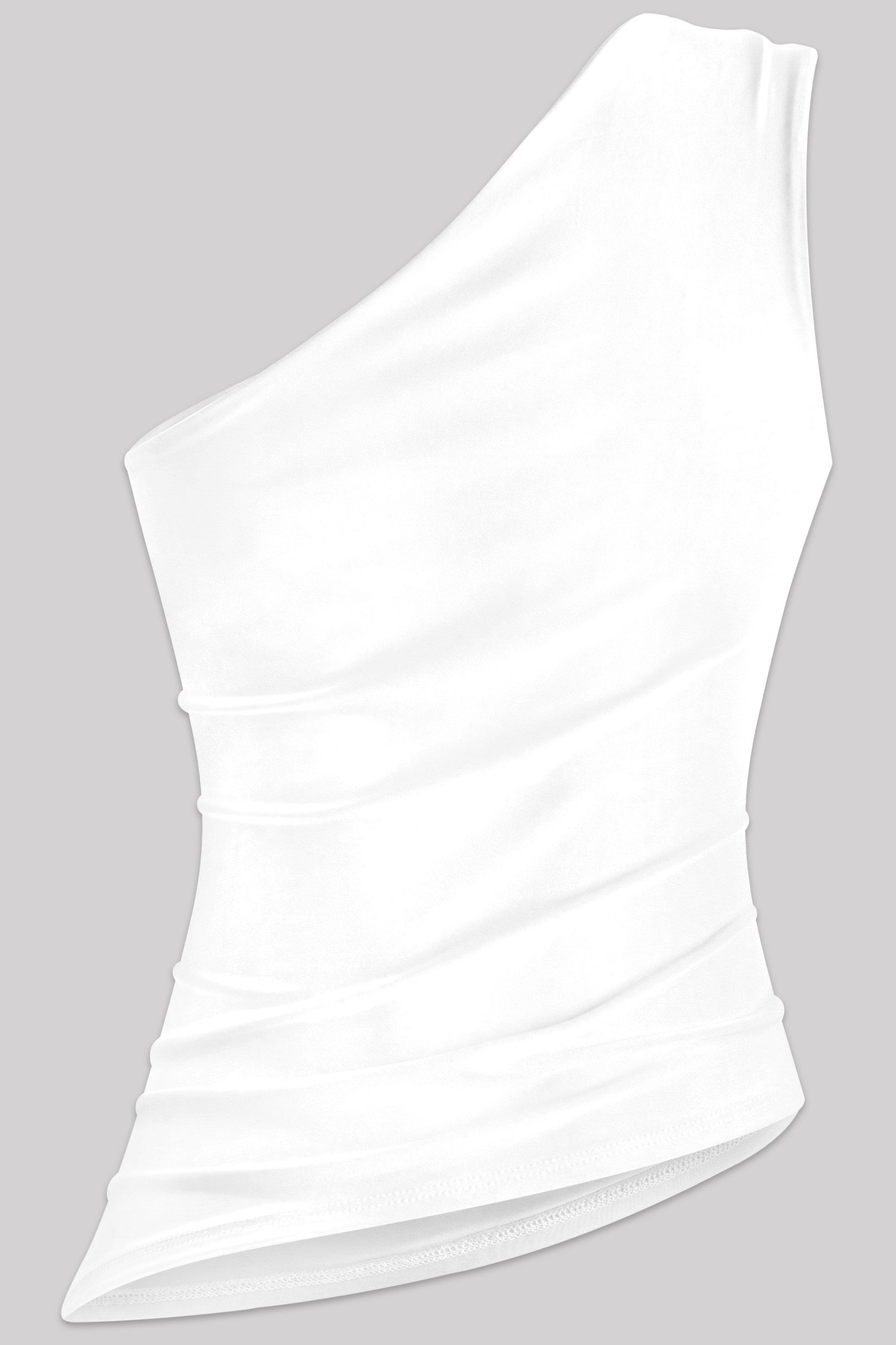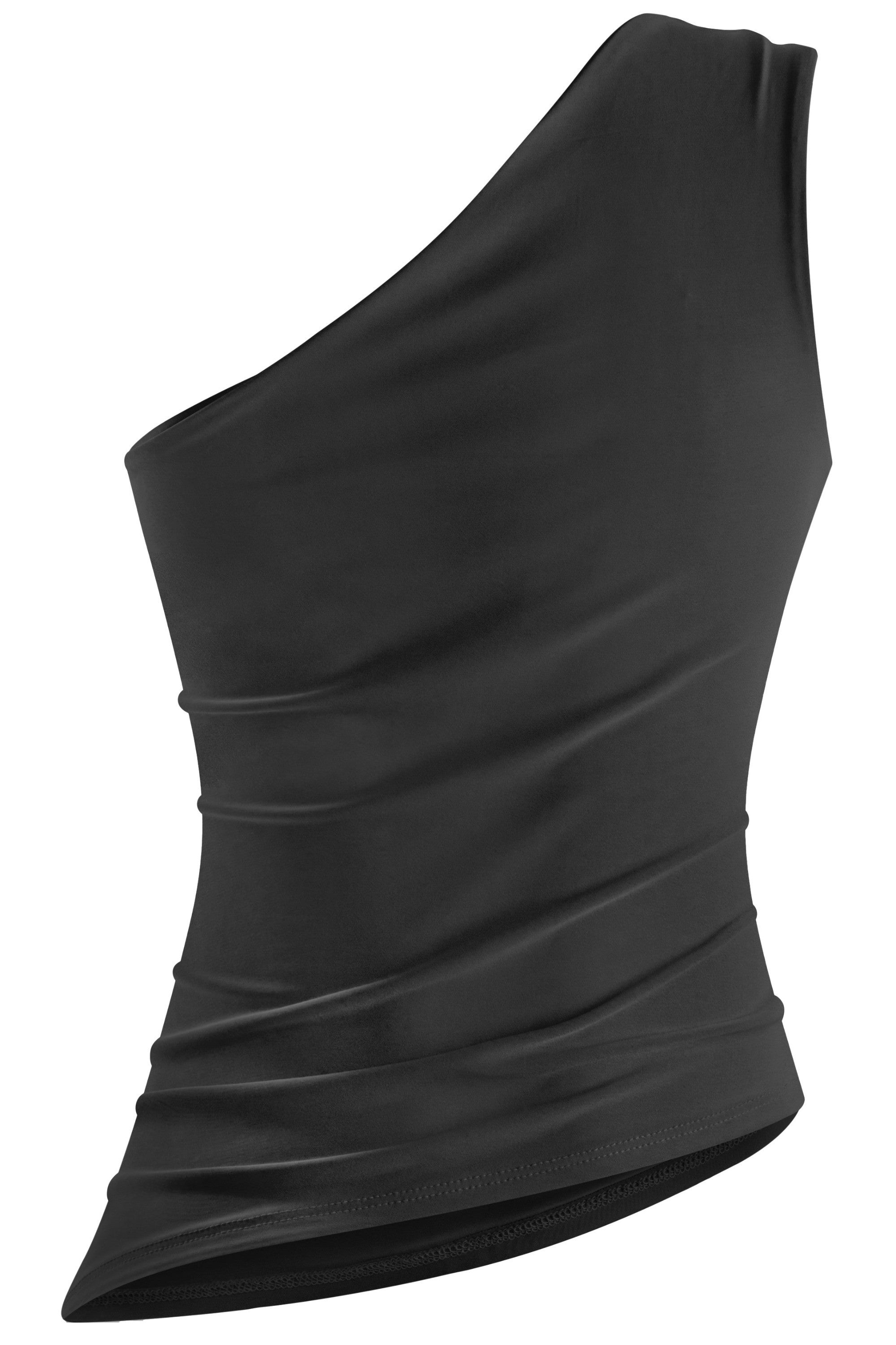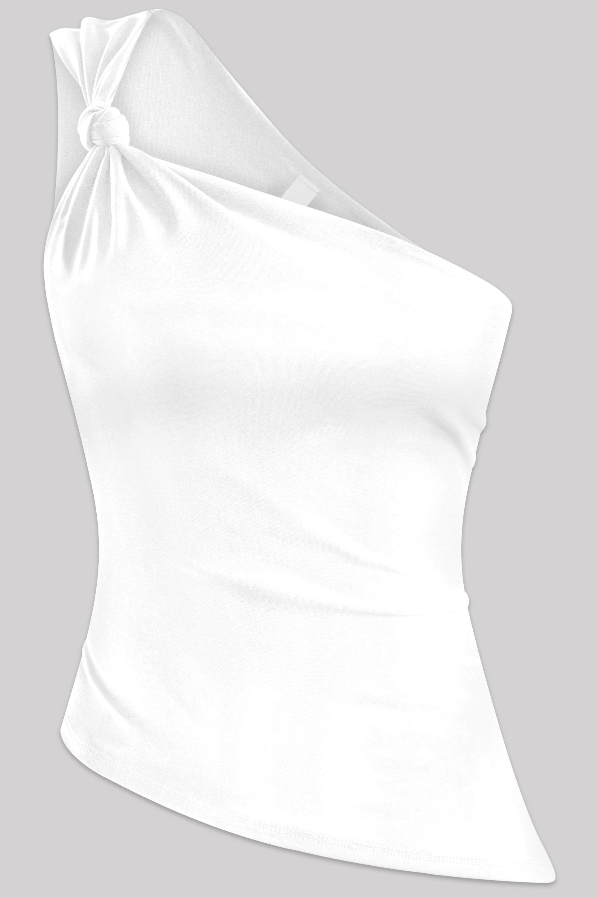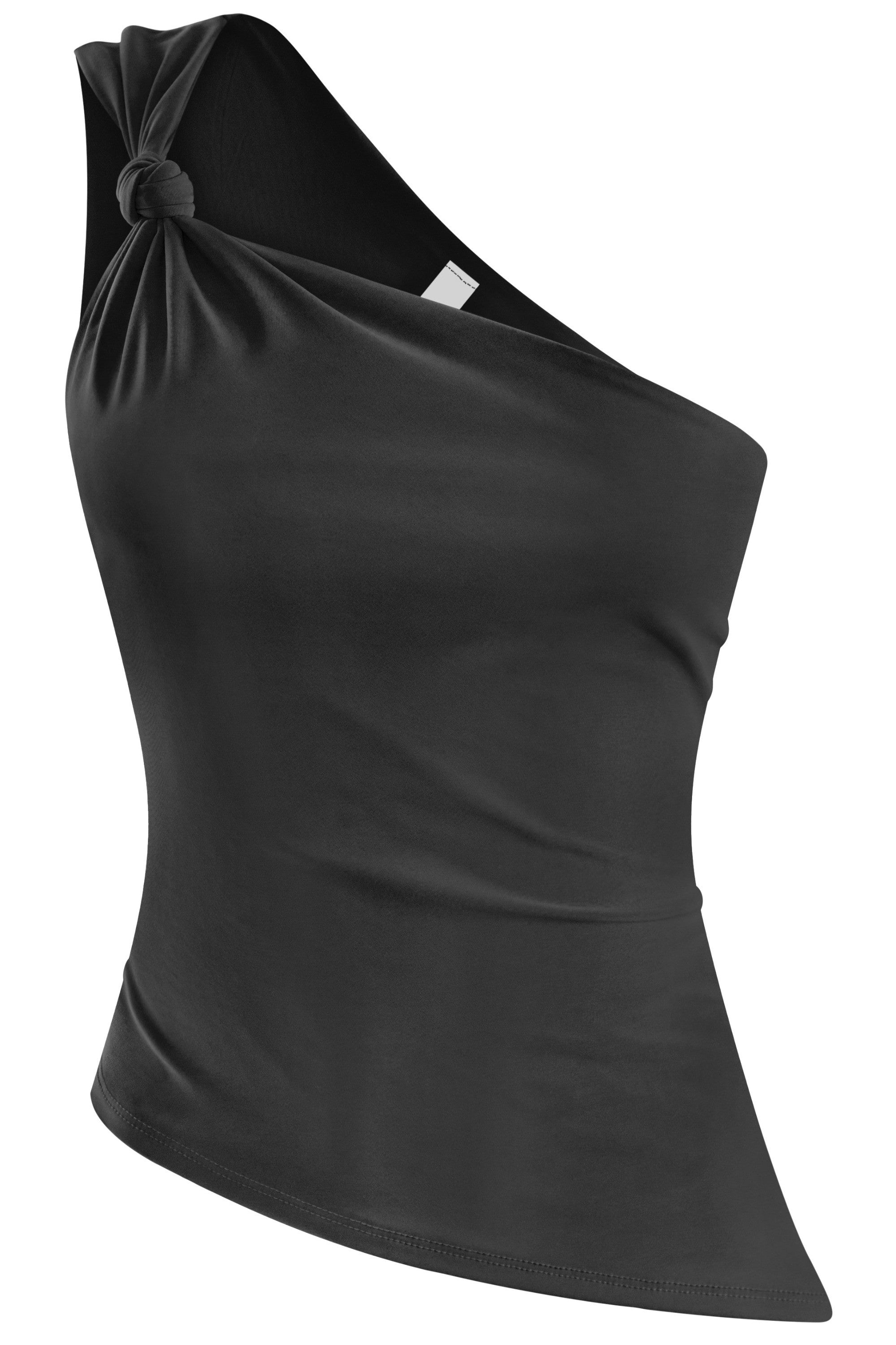 One-shoulder top with a knotted detail and asymmetrical hem. Made from a stretchy, slinky fabric that hugs the body and moves with you. Double layered for a smooth fit — bold, minimal, and easy to style.